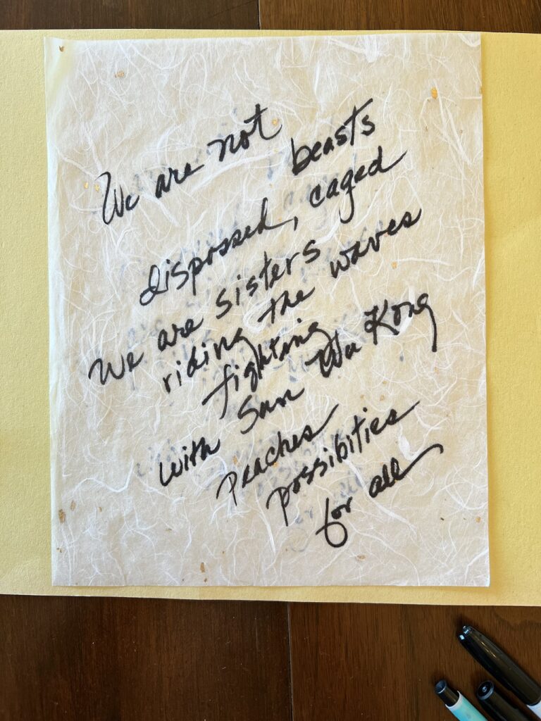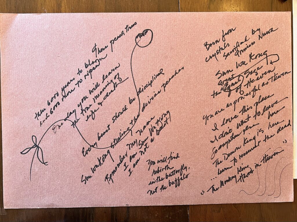 Through this collaborative work of art, we share our mutual fondness for the immortal Monkey King, whose story has sweetened our journey—as friends, artists, and Chinese American women seeking to uncover, understand, and breathe new life into long-buried history. Channeling Sun Wukong’s curiosity, cleverness and indomitable fighting spirit, we honor our ancestors with our art and poetry, in both the physical and virtual realms.