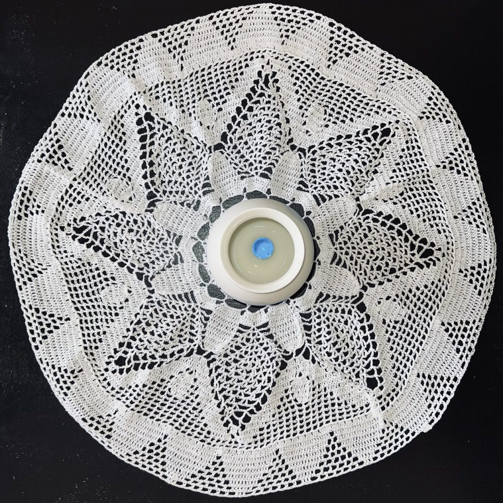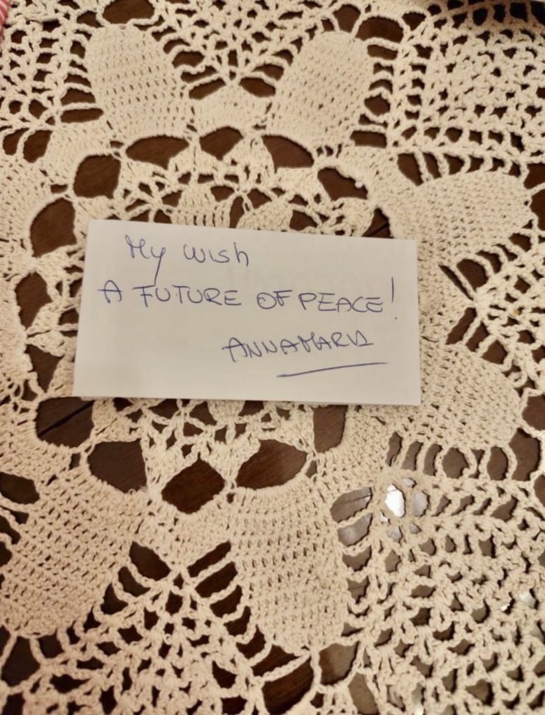 When Andi got back home, there was a package waiting for her. This surprise gift, crafted by her Blue Marble friend, Anna Maria in Rome, Italy, had finally arrived. The package had been held up with the end of the duty-free de minimis exemption for low-value packages to the United States, when many countries, including Italy, suspended postal service to the United States. But when the gift arrived, the doily fit the Moon Jar perfectly — just like magic! Anna Maria was invited to make the first wish for the Moon Jar.